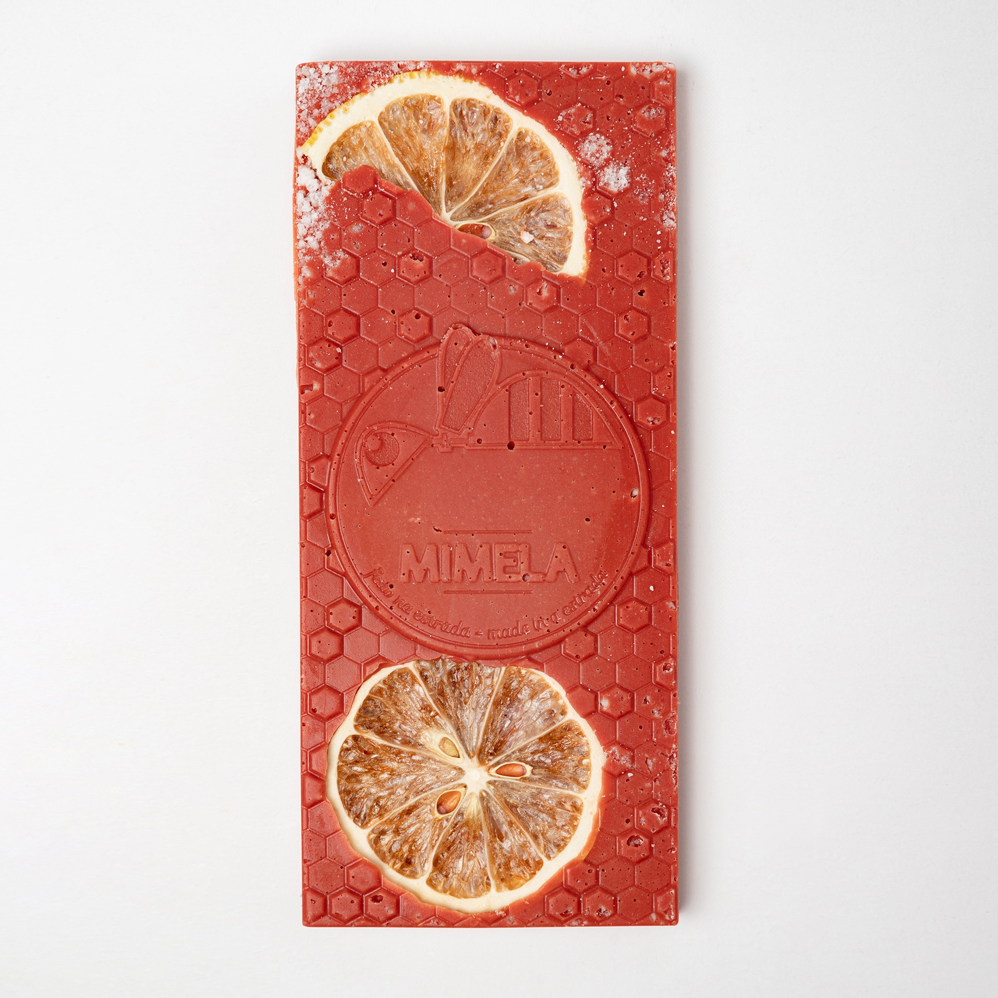 INGREDIENTES: AZUCRE, MANTEIGA DE CACAO, FRESAS EN PO, LECITINA DE XIRASOL CON LIMÓN E MENTA CRISTALIZADA (SACAROSA E MENTA).