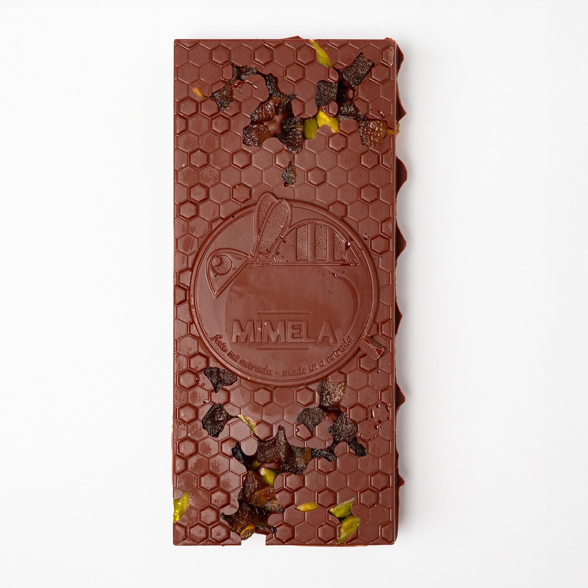 INGREDIENTES: FABAS DE CACAO DE BRASIL, AZUCRE MORENO, MANTEIGA DE CACAO, LEITE, VAINILLA DE MADAGASCAR CON PERA WILLIAMS E PISTACHO DE SICILIA.